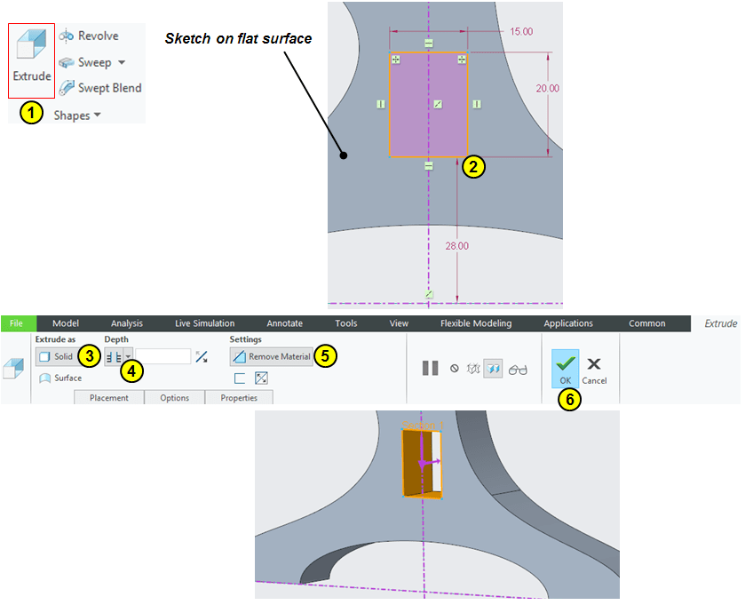 Click again on Extrude icon and on the flat suface sketch a rectangle as shown:
