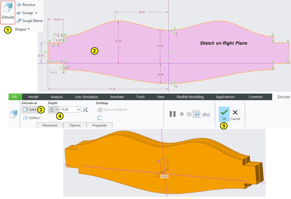 Click on Extrude icon and on Right Plane Sketch the following profile, then extrud it 15mm by mid-plane: