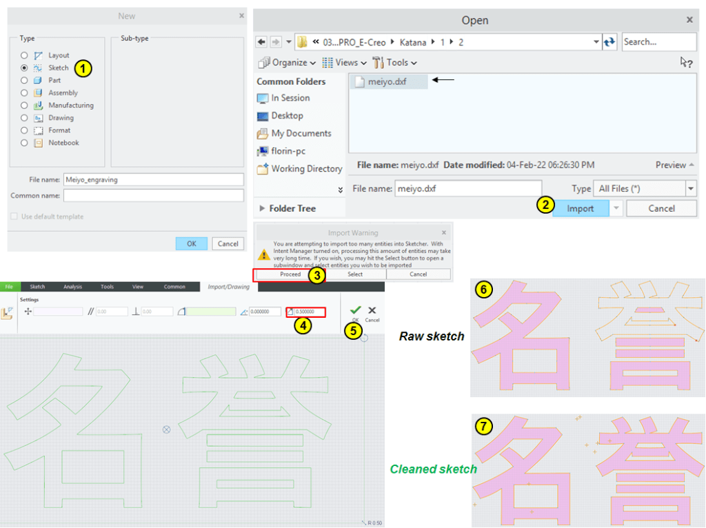 Once the dxf is available, sometimes you can use it directly in CREO sketches but in this case I suggest you to create an additional sketch file where you make the clean version before to use it in CREO part file. This is becasue, the conversion creates a raw sketch made of lines and a lot of inflexion points which won’t really give you the result you expect on the 3d Part.