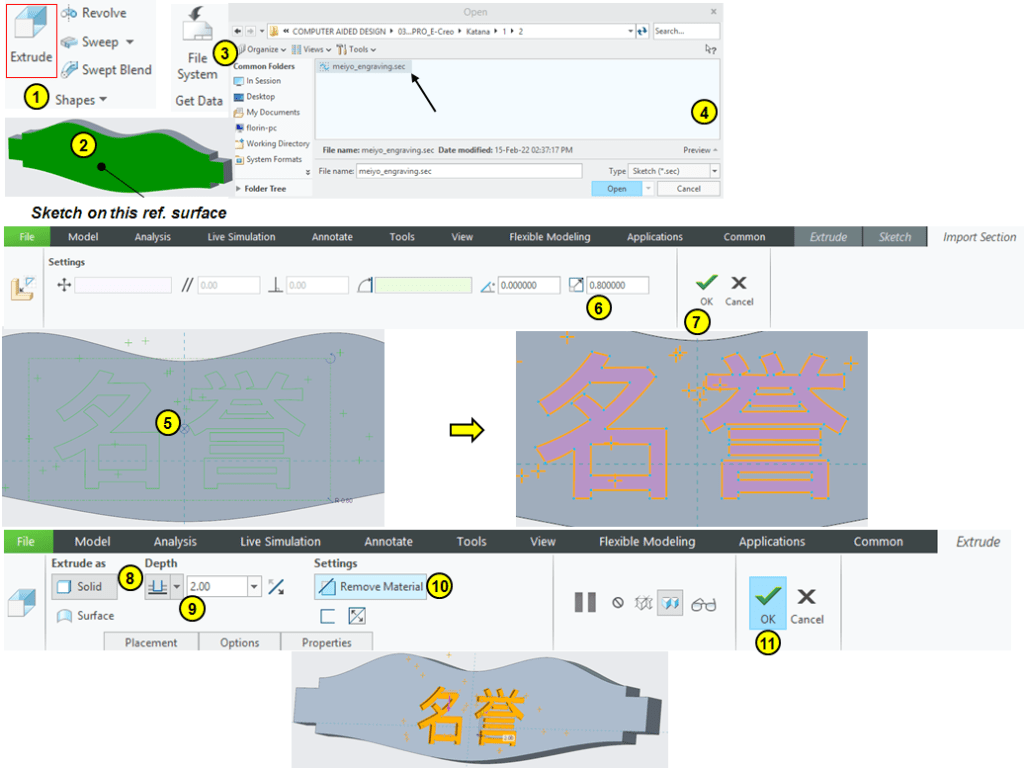 Click on Extrud icon and select the flat surface a reference for sketch plane. In sketch workbench click on File System icon (n°3) and open the previosly saved Sketch file. Then adjust the position + scale and remove 2mm of material as show: