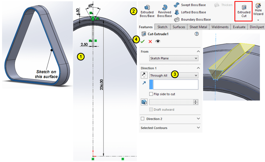 Sketch a centerpoint arc slot on the inner planar surface and cut-extrude it through all