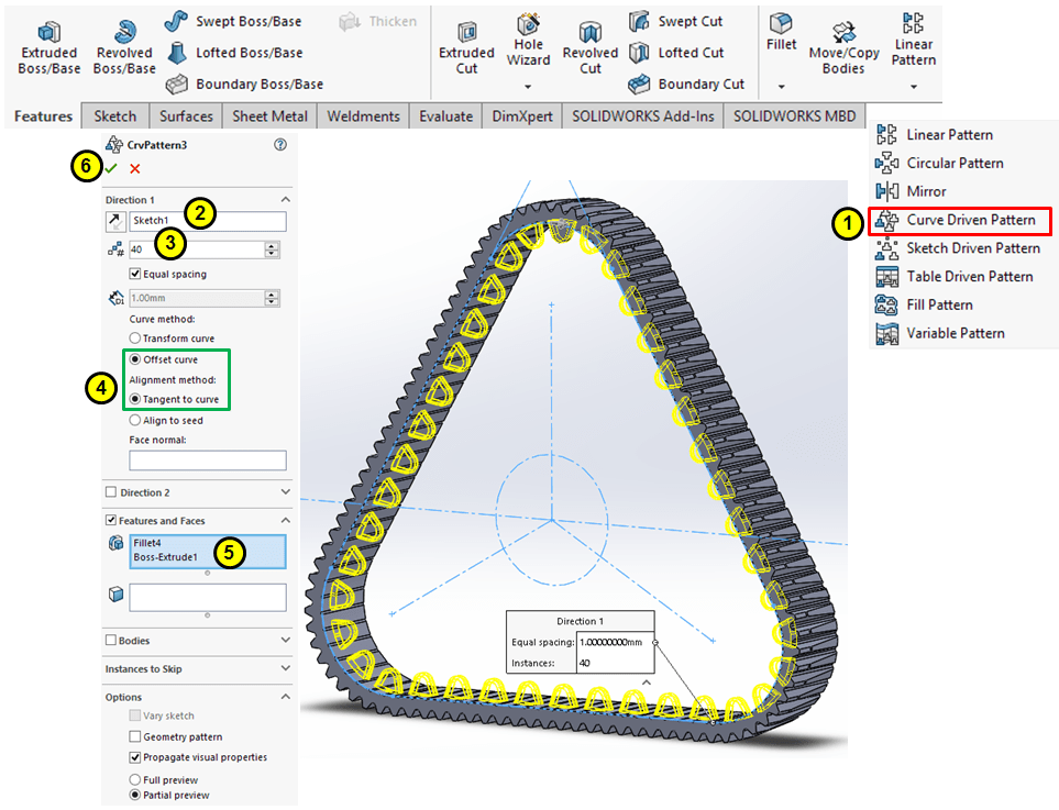 Use the 1st Sketch created at STEP 2 as guide to create a Curve Driven Pattern of 40 instances with the previous extruded boss on inner surface as shown: