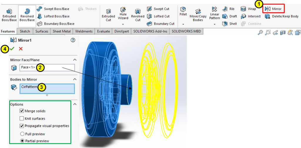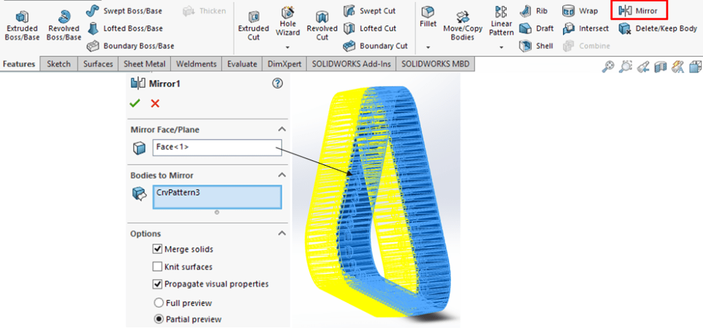 Apply the Mirror feature on the frontal surface: