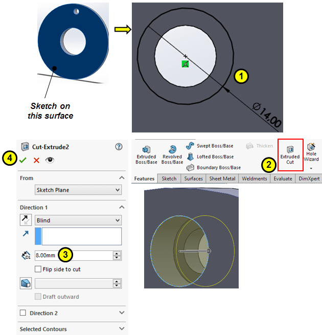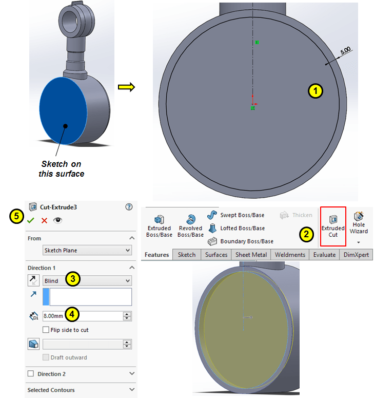 Remove material from the front side of the base cylinder with a cut-extrude of 8mm deep.