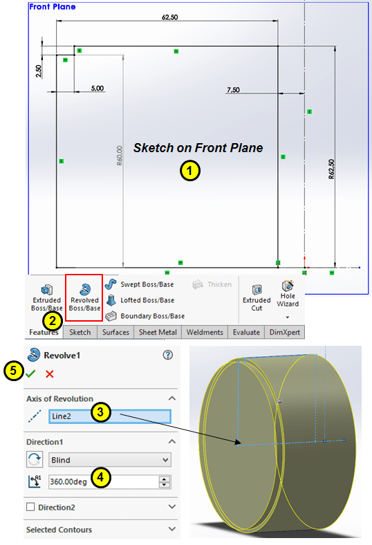 On front plane draw the following sketch and revove it into a complete cylinder