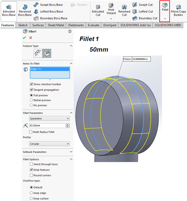 Add a fillet of 50mm on the mid-edge