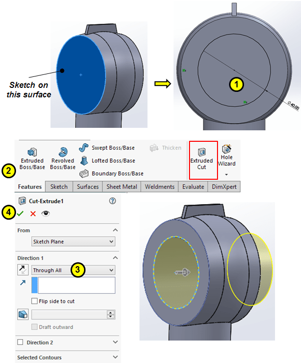 On the frontal planar side sketch a circle of Ø40 and cut-extrude it through all