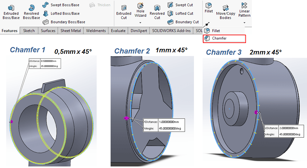 Apply chamfers and fillets as follows: