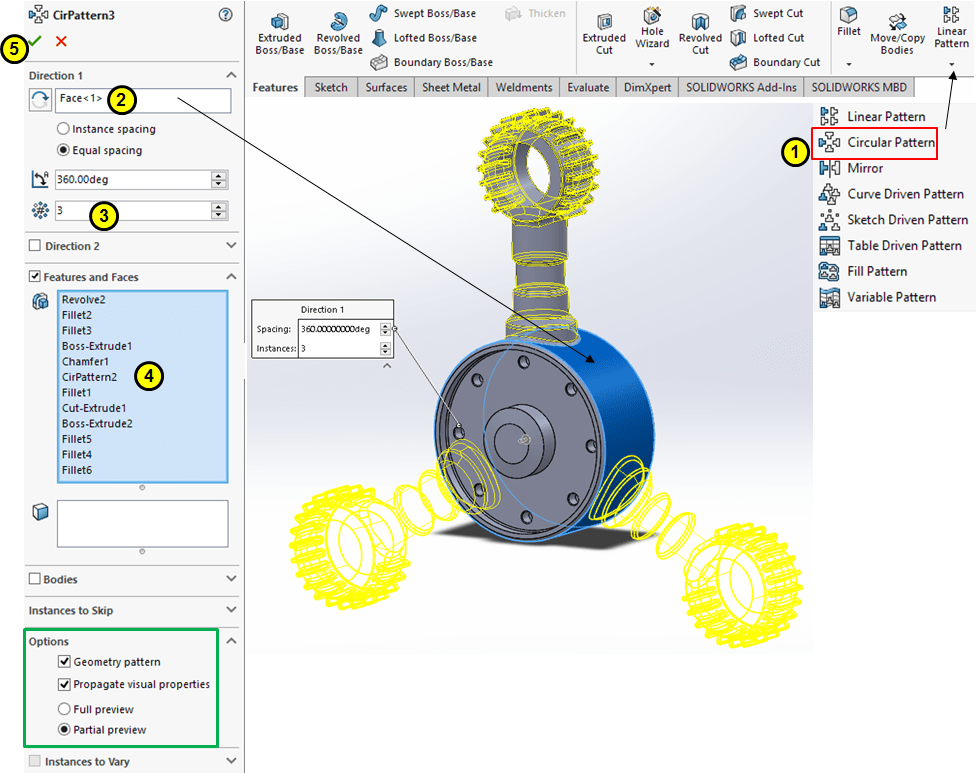 Pattern the last 3 features around the outer surface as shown: