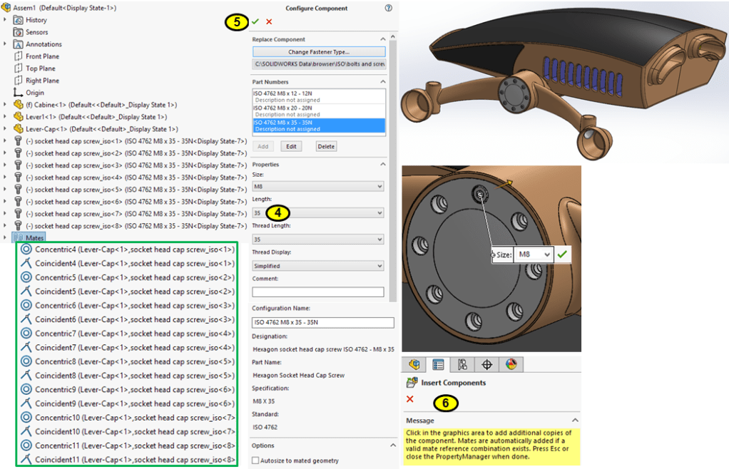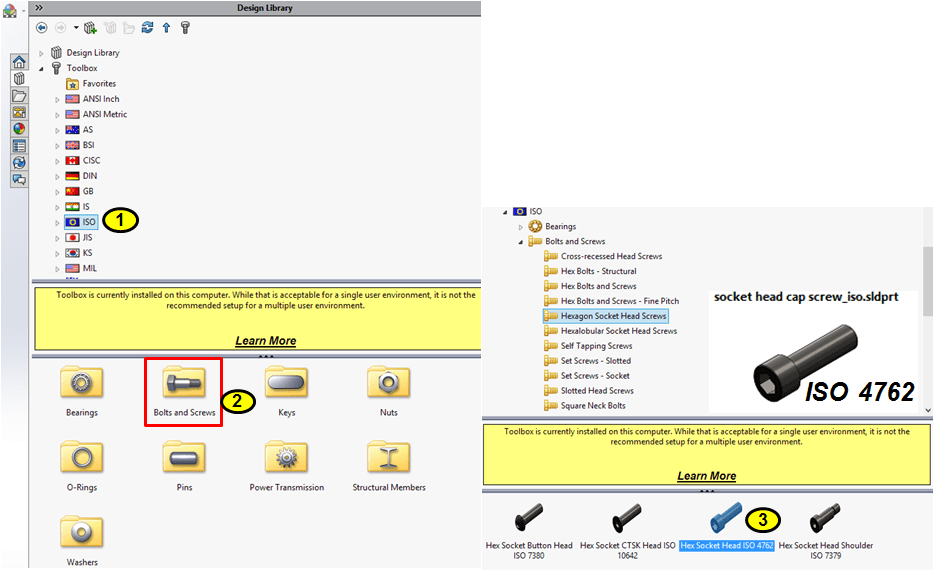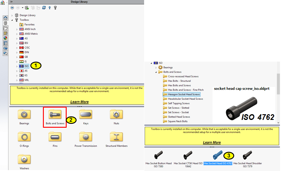 Often times Standard components are used too. But these don’t have to be designed again frim scratch. The Solidworks Design Library contains a variety of such components according to differents international standards so that they are available and can be anytime used. This saves a lot of time and you don’t have to worry designing these components. Just find in the library what you need and use it. In my case here, I’ve chosen for a Socket Head Cap Screw acc. to ISO 4762. The browsing steps in the Design Library are as follows: