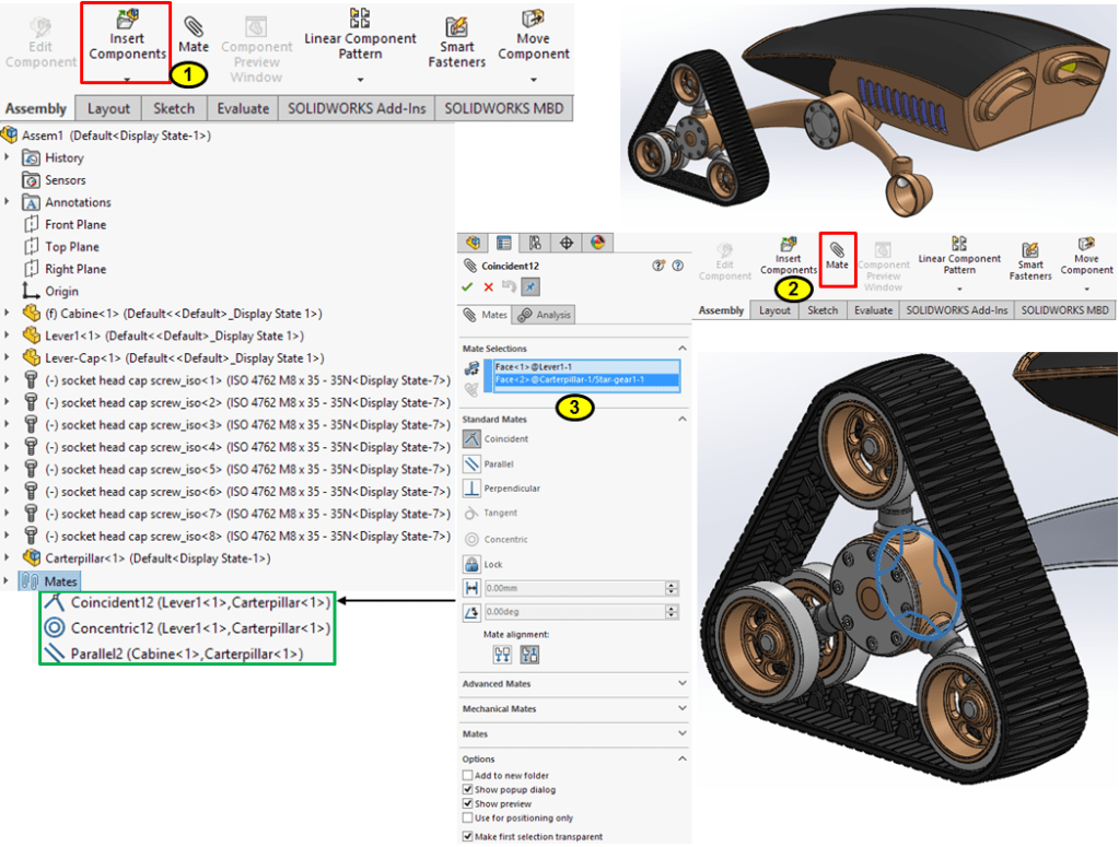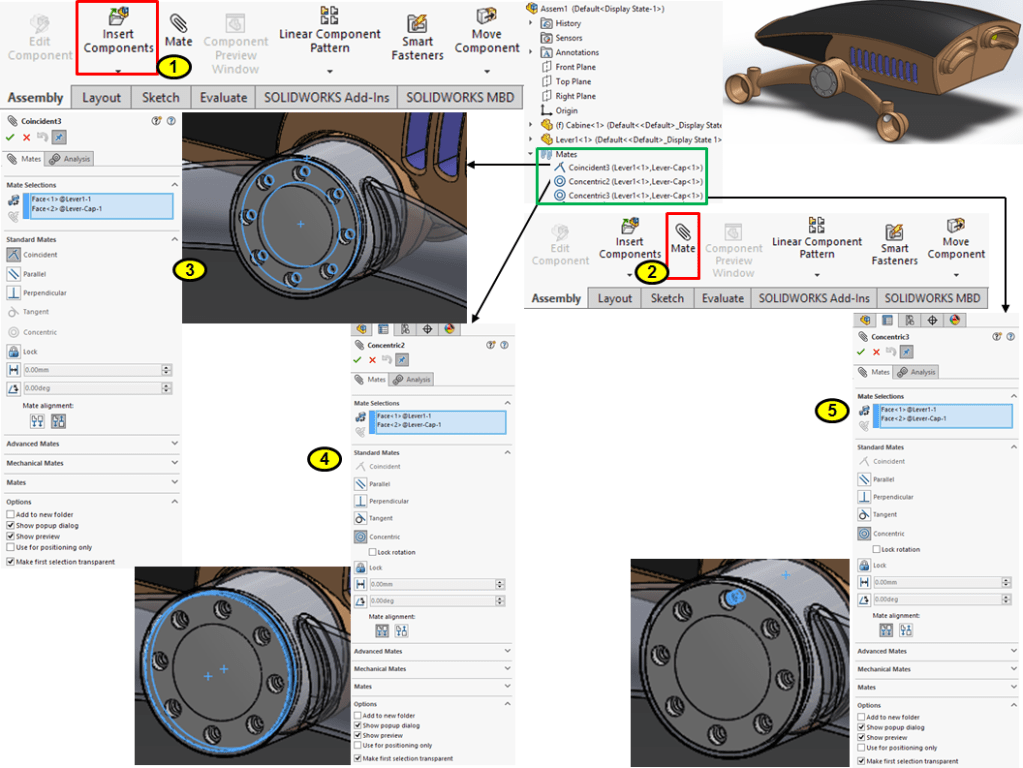 In Assembly Mode, click on Insert Components and continue to add new components in the same way. The next one being the part called Gear-Cap. Then Click on Mate icon and enter the 3 constraints as shown below: