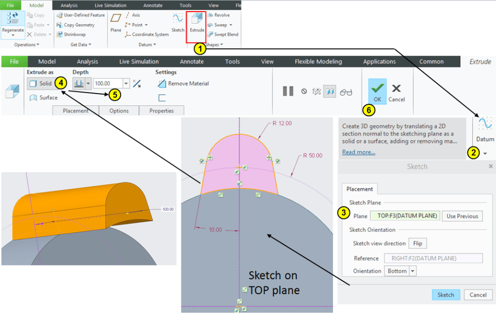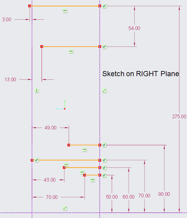 Click again on Extrude icon –> Select the TOP plane as sketching plane –> draw the profiles as shown then extrude it 100mm in length: