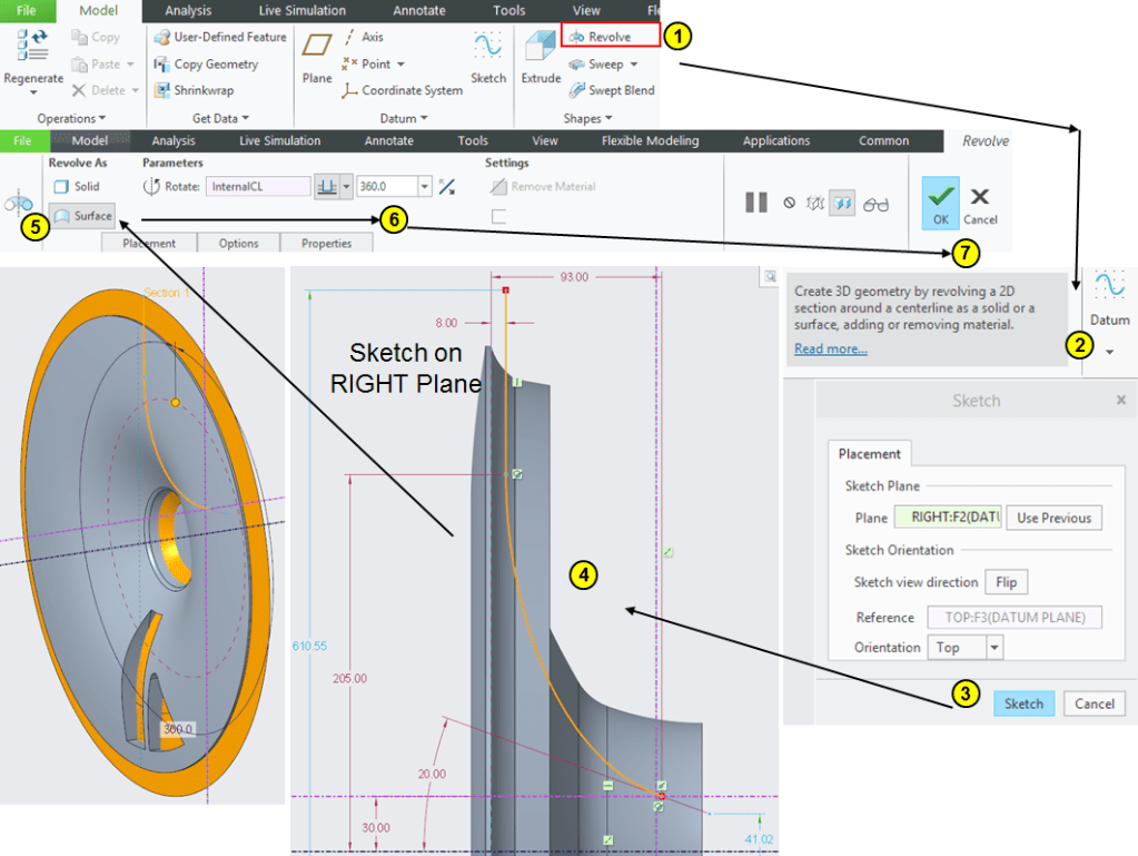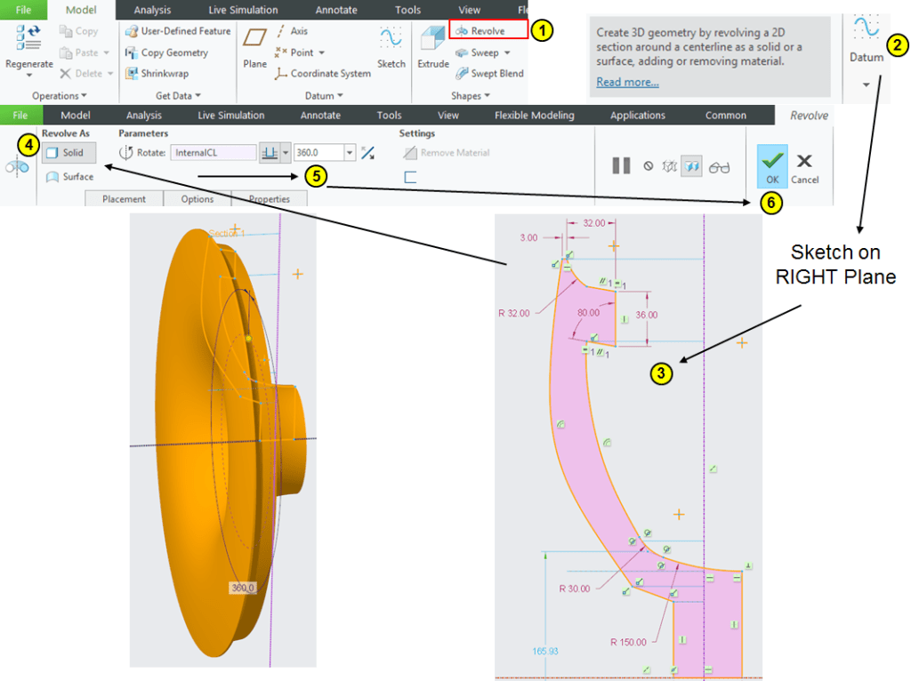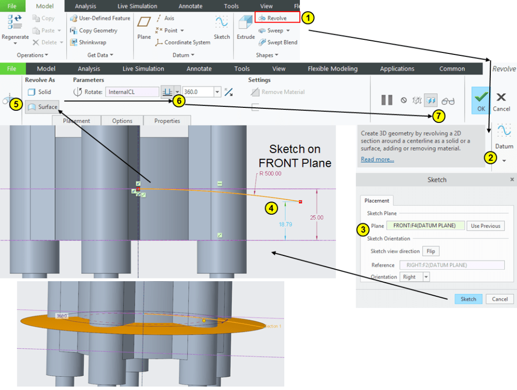 Click on Revolve icon, select the FRONT plane as sketching plane and create a revolved surface as shown:
