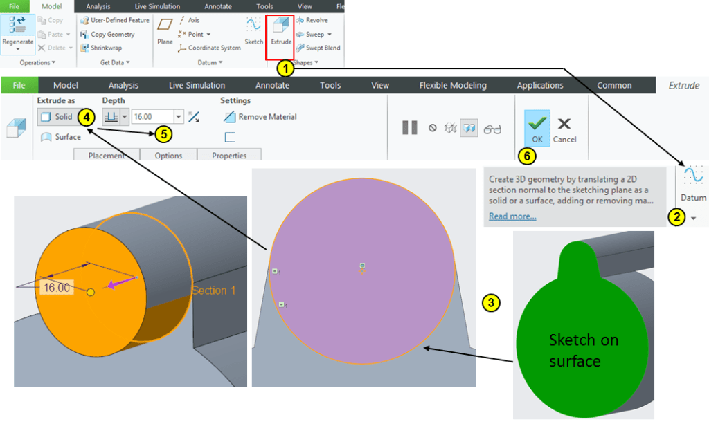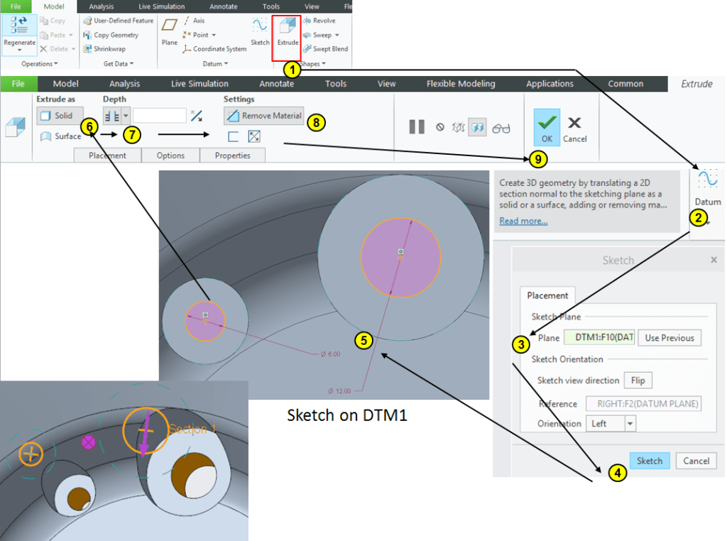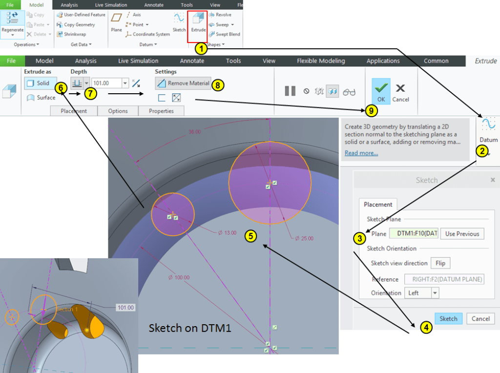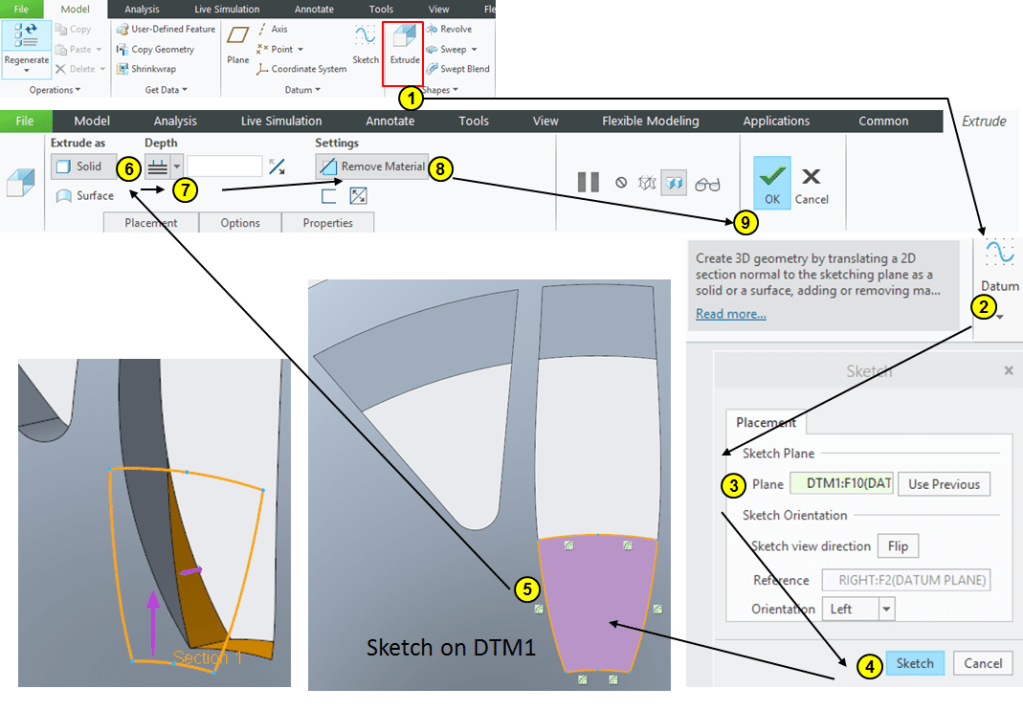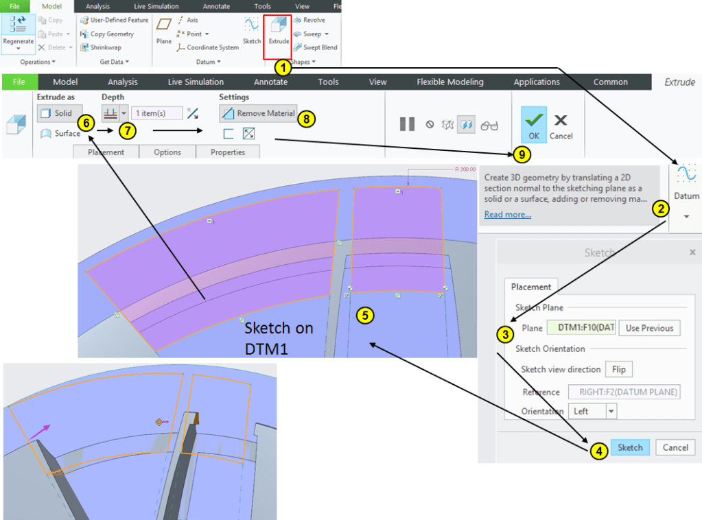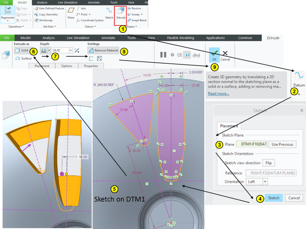 Click on Extrude icon –> select the DTM1 as sketching plane and draw the profiles as shown, the long profile being made by connecting the points from the previous sketch from STEP 7. Then Extrude everything at 38mm depth as removed material: