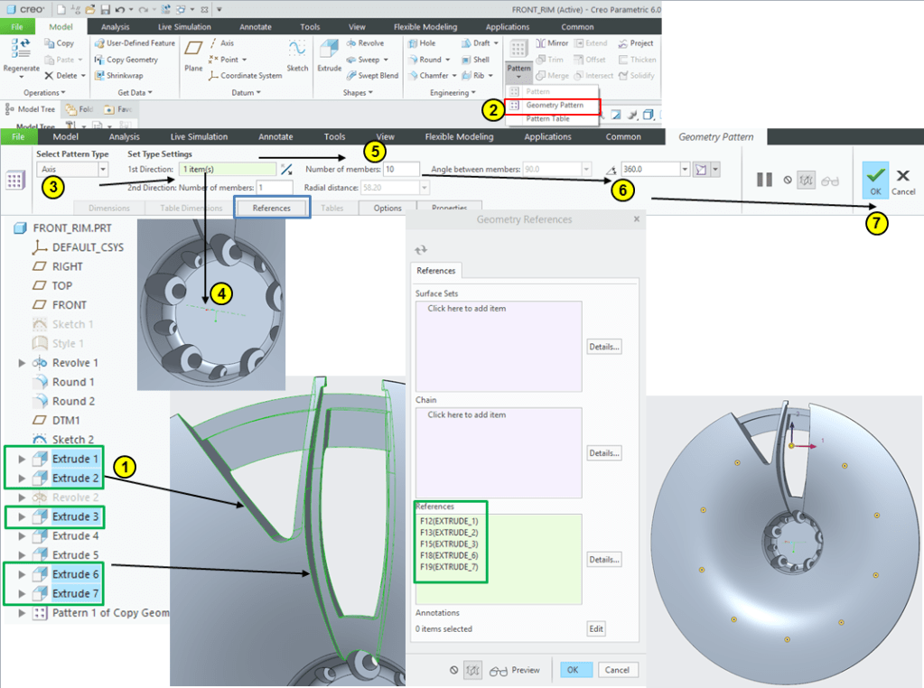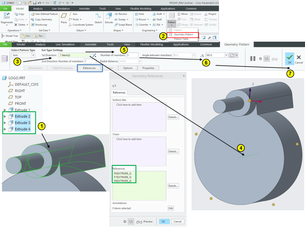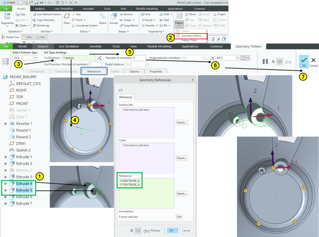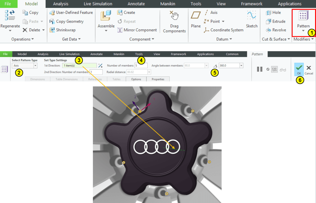 Keep the M6 Screw selected in the Model Tree –> click on Pattern icon –>create a pattern of 5 instances aroud the rim axis: