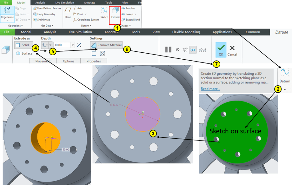 Keep the previous Extrude feature (Hole) selected in the Model Tree and click on “Patern” icon then enter the Pattern parameters for 30 instances: