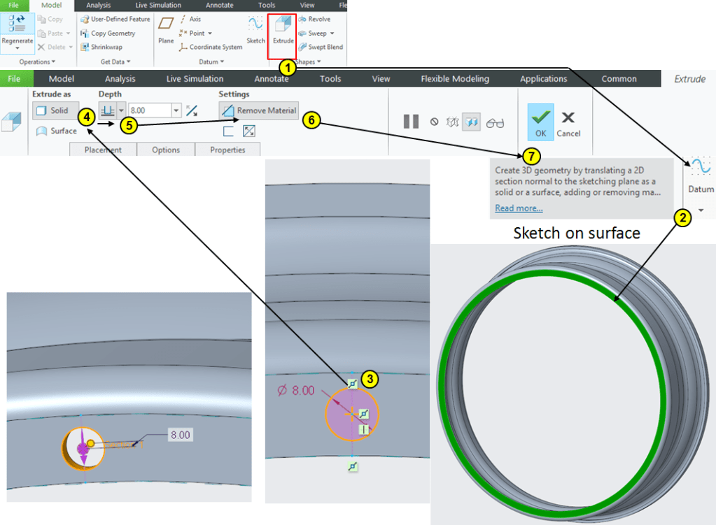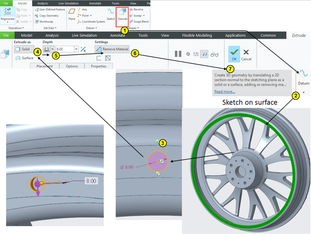 Click on Extrude icon and select the surface on the rim’s frontside. Draw a cirlce of Ø8mm and extrude it at 8mm depth: