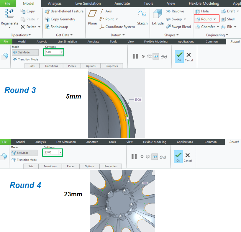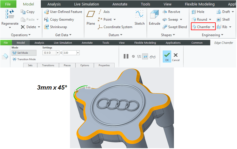 A wheel rim design can be done in different ways, depending on the wanted pattern and the used CAD software. In this example I show you a version of Wheel Rim used on AUDI cars and how to do it in CREO Parametric CAD software. A wheel rim can also be done in 1 piece but the one I will show you next it’s done in 3 main bodies: The Front Rim, The Rear Rim and the Audi Logo part.