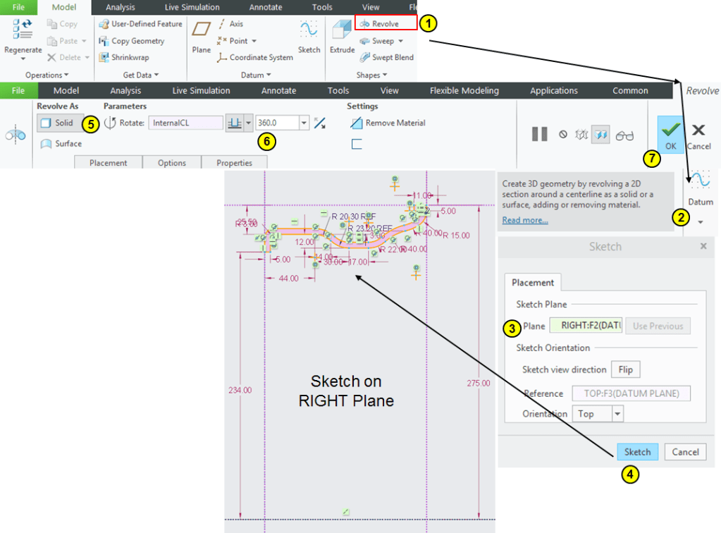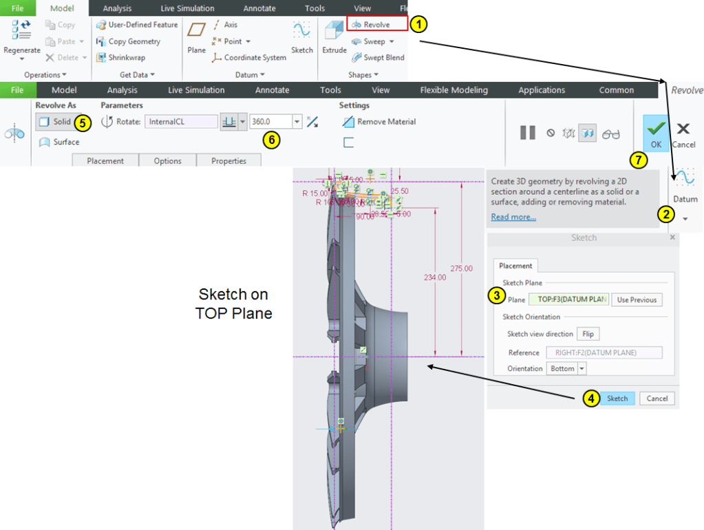 Click on “Revolve” icon, select the TOP plane as sketching plane and draw the profile as shown: