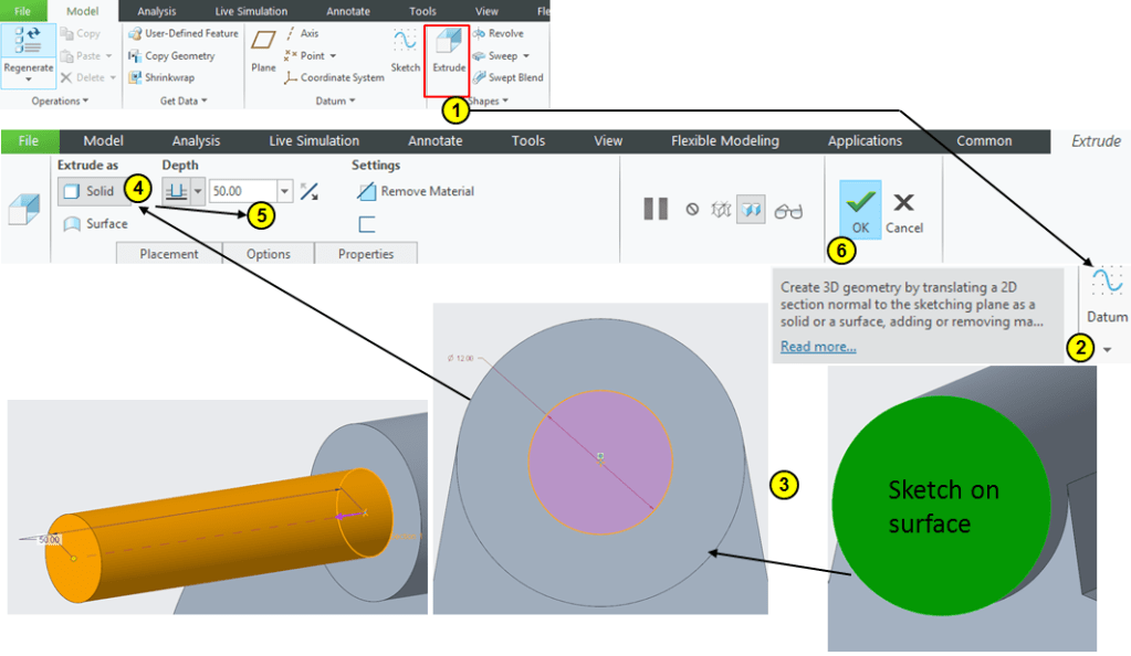 Create the 4th Extrude as Ø12mm circle at 50mm length: