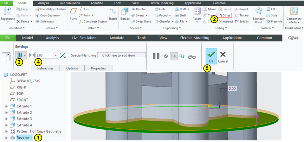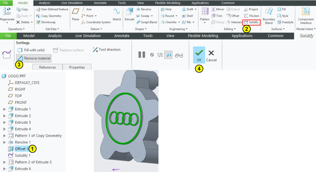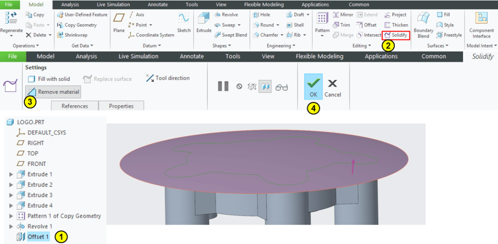 Keep the Offset1 feature selected in Model Tree and click on Solidify icon –> remove the material above Offset 1 as shown: