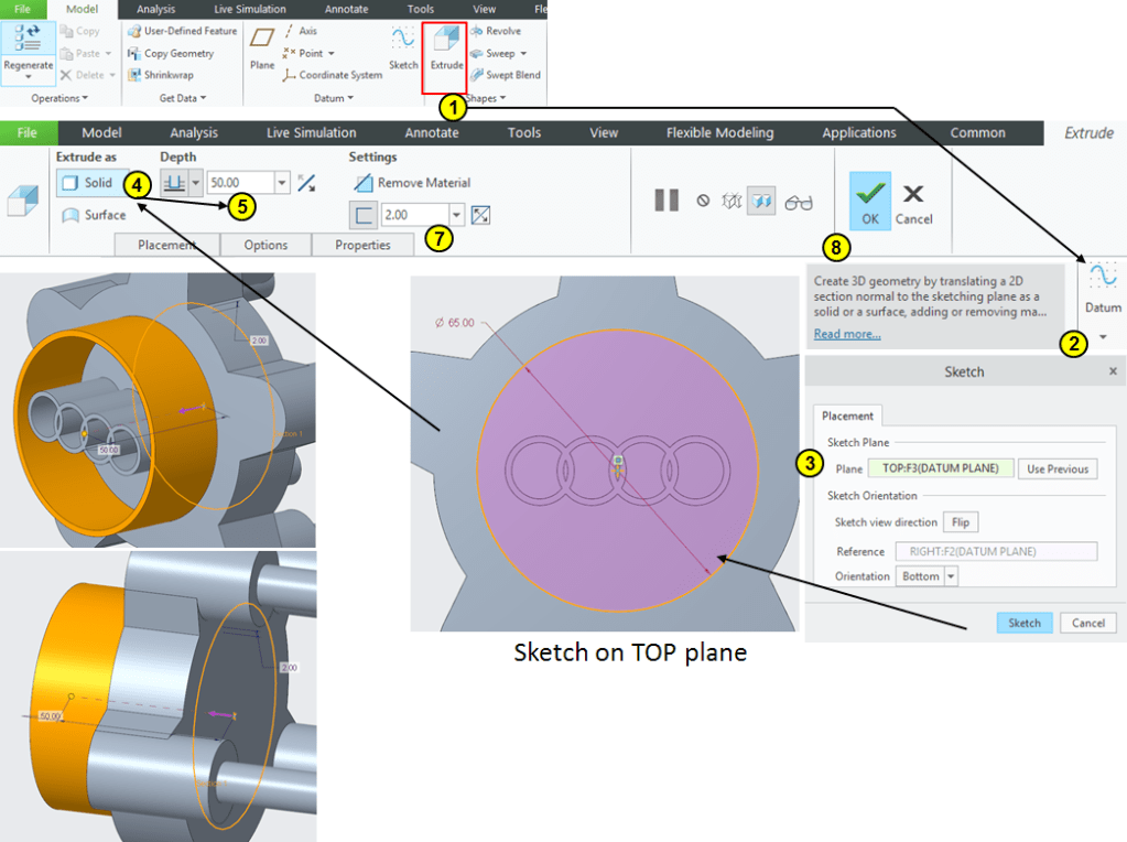 Click on Extrude icon–> Select the TOP plane as sketching plane–> draw a circle of Ø65mm and extrude it 50mm in length as 2mm thick profile: