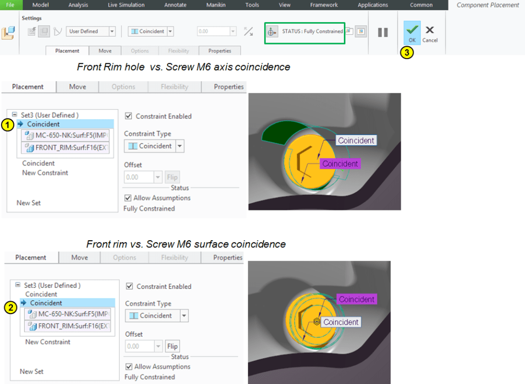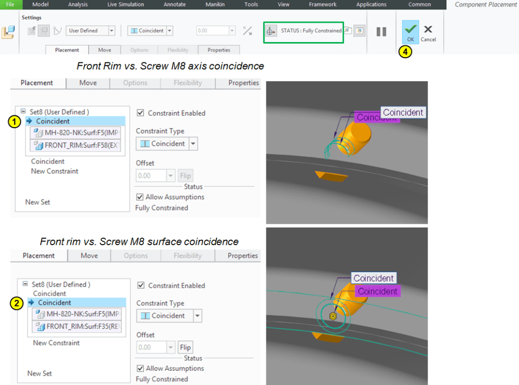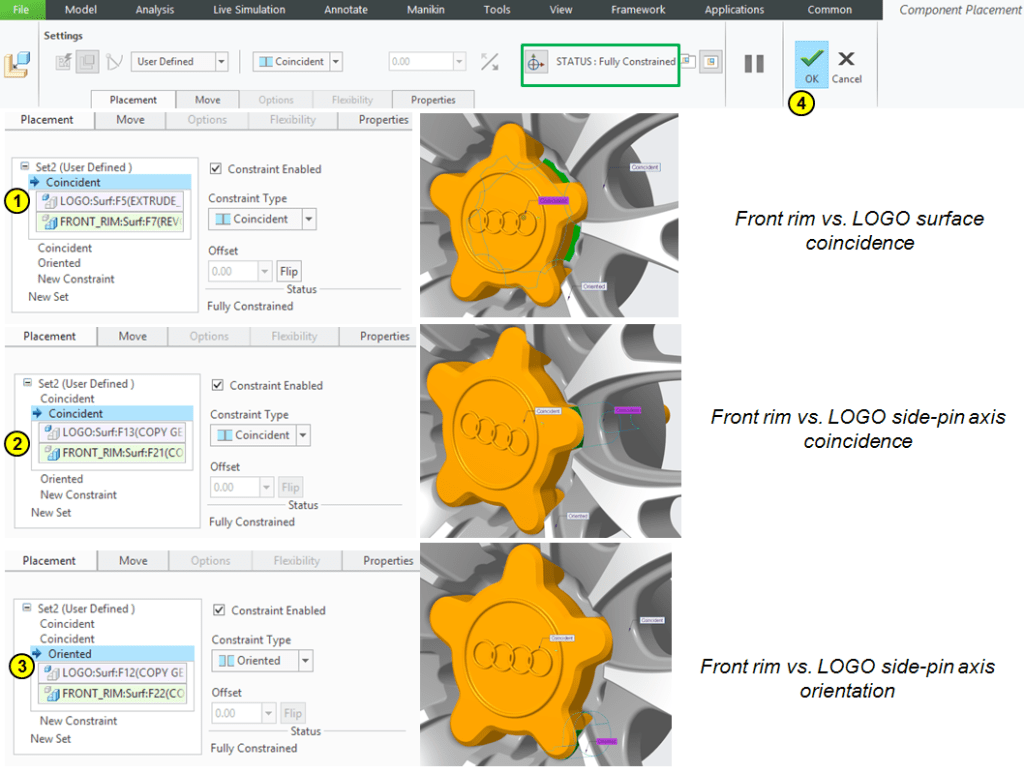 In the same way click on the Assemble icon to add the rest of components. Continue with the Rear_Rim part having the following constraints: