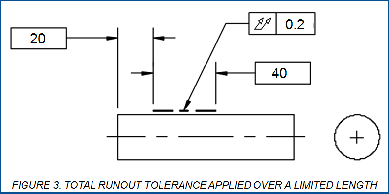 Since a runout tolerance applies to surface elements, it sometimes makes sense to limit the control to a limited portion of a surface, over a limited length. A designer can do this easily by applying a chain line as shown in figure 3. In such cases, draw a heavy chain line adjacent to the surface, basically dimensioned for length and location as necessary. The Total Runout tolerance applies only within the limits indicated by the chain line.