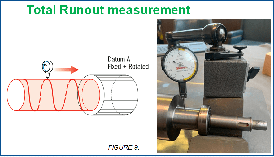Another method for measuring total runout is to take one gauge held perpendicular to the surface of the part, and slowly move it across the surface of the part axially as the part is rotated. If the gauge varies at any point by more than the total runout tolerance, the part would be out of spec.