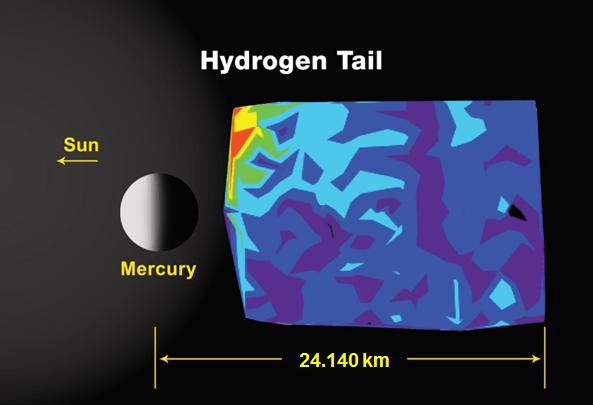 While it rotates so fast, Mercury has a tail. Mercury’s sodium and hydrogen tails MESSENGER’s ultraviolet and visible spectrometer, part of the M.A.S.C.S. instrument (Mercury Atmospheric and Surface Composition Spectrometer), mapped the tail of Mercury as the spacecraft approached for its first flyby of the planet. The plots below show the intensity of the emission of certain wavelengths of light, which is related to the abundance of neutral atoms in Mercury’s exosphere.