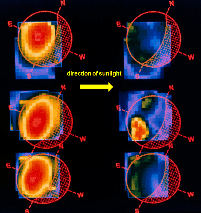 Temporary atmosphere = Thin clouds of sodium suddenly appear over some regions of Mercury and then just as quickly disappear, as seen below in these false-color observations made by the Kitt Peak Solar Observatory, USA. The cloud might be produced by meteorite impacts – the freshly cratered surface releases sodium vapour when it is next heated by sunlight. Another possibility is that ionized particles actually hit Mercury’s surface and release sodium from the regolith.