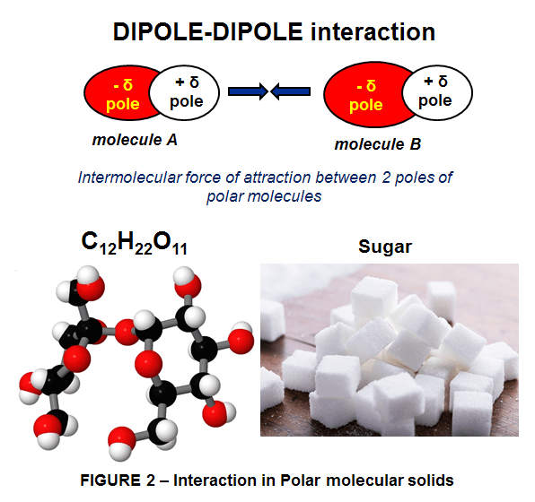 The polar molecules HAVE a positive side and a negative side due to the uneven distribution of electrons in the molecule. Here the molecular solids are held together by dipole-dipole interactions. The dipole-dipole forces are stronger than London forces, making substances with such kind of interaction between the molecules in their structure, to have higher melting points than molecules held by weaker London forces, namely non-polar molecular solids.The bonding electrons in polar molecular solids are pulled closer to the atoms in the molecule with the greatest electronegativity. This makes one end of the molecule slightly negative, while the other end of the molecule is slightly negative, such as in sucrose ( C12H22O11 a.k.a. table sugar – Fig 2.)