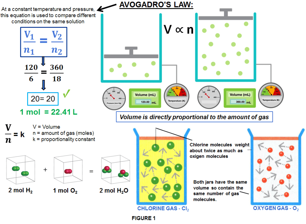 That means if the amount of gas increases, then so does its volume. For example, even though molecules of chlorine (Cl2) gas have a mass about twice that of oxygen, there will be the same number of molecules of each in containers of the same size and at the same temperature and pressure.(as shown in figure 1)