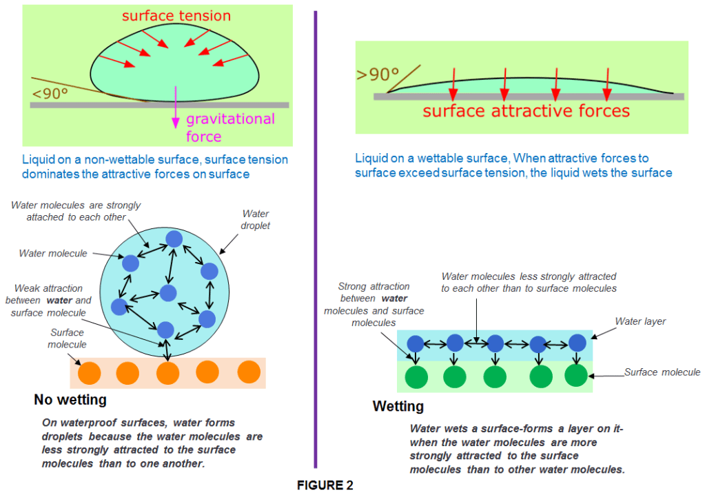 Wetting is the degree to which a liquid keeps contact with a solid surface. Whether a liquid wets a surface depends on the strength of the attractive forces within the liquid relative to the forces between the liquid and the surface.