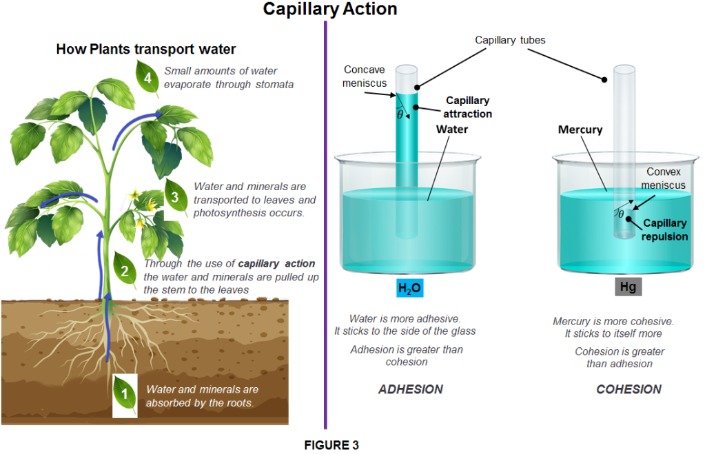 Adhesion also accounts for capillary action which is the tendency of a liquid to ascend narrow cylinders or permeable substances when a liquid is drawn up into such objects. One example of capillary action is when someone collects a sample of blood by touching a tiny glass tube to the blood droplet on the tip of a pricked finger. The combination of cohesive and adhesive forces means that a slight concave/convex curve, known as the meniscus, exists at the surface of most liquids. The most accurate measurement of the volume of a liquid in a graduated cylinder will be observed by looking at the volume marks closest to the bottom of this meniscus.