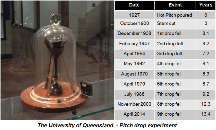 In 1927 Professor Thomas Parnell of the University of Queensland conducted an experiment to see what would happen to black tar if it was left to settle in a funnel. What he found was that, over days, it behaved like a solid, staying just where he put it. But over months and years it started to creep and behave like a liquid. Indeed, it flowed down the funnel and started to form droplets.