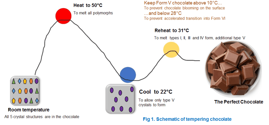 How exactly tempering works? => It’s quite simple process to follow. Just melt chocolate to 50°C. Cool it to 22°C so that only Form V is allowed to condensate at lower temperature), notice that Forms III, IV and V have similar melting points. Therefore, for best results, heat again to 31°C, which is warm enough to melt forms I,II, III and IV, then re-cool to 22°C to allow them to re-crystallise as Form V. Repeat again if greater Form V purity is desired.(see the schematic principle in fig 1)