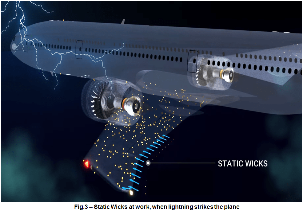 Aircraft parts such as wings tips, nose, tail and fuselage are tested in high voltage laboratories. These labs simulate the electrical energy of a lightning strike to test how well the materials and components can handle being struck. Researches observe how the lightning travels across the surface and verify that the energy safely disperses without damaging critical parts. But even though planes are designed to withstand a lighting strike they are also fitted as I’ve already mentioned earlier with static discharges or static wicks. You will find metal strips on the nose of airplanes and small rods on the wings and wing tips, their primary purpose being to dissipate static electricity that build up on the aircraft during flight due to friction with the air.