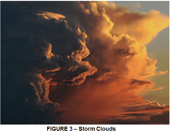 Storm Clouds like the one shown in Figure 3 form in unstable air. Water vapour condenses, releasing latent heat so the air continues to rise. Violent vertical currents in the cloud may produce a thunderstorm.