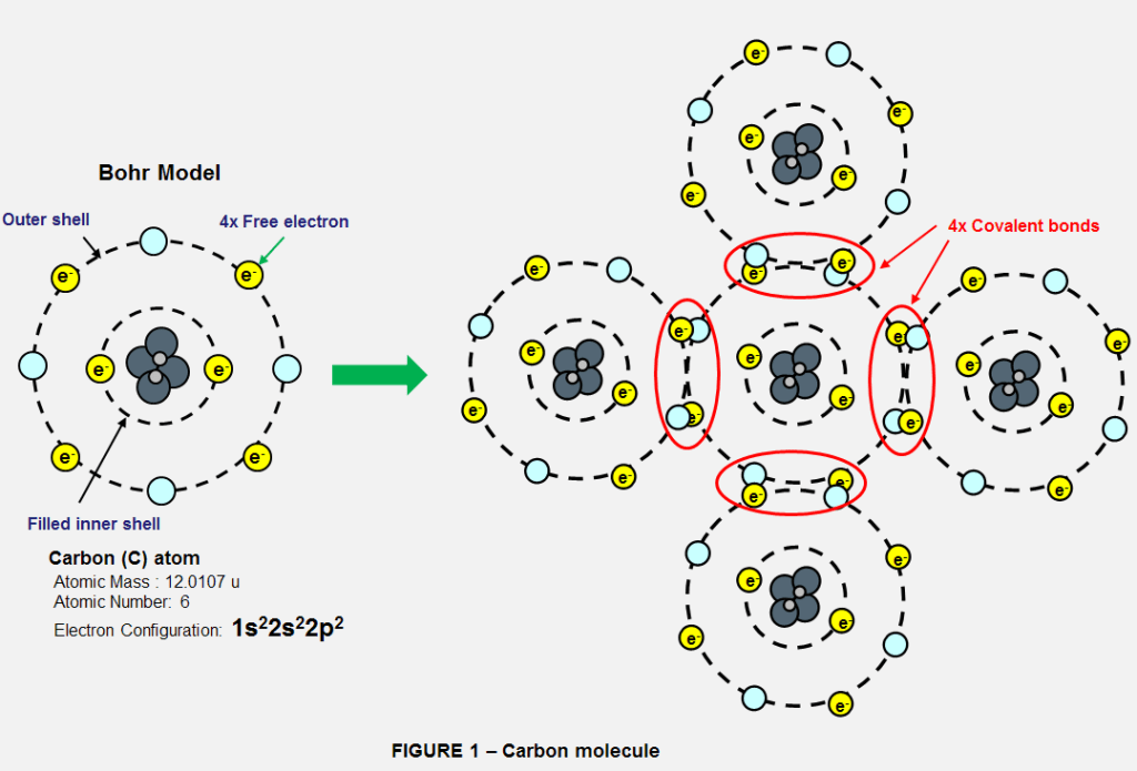 Take hydrocarbons. These are molecules formed between Hydrogen (H) and Carbon (C) atoms. Hydrogen has 1 electron, and seeks 1 electron to fill it’s inner shell. So, carbon likes to form 4 covalent bonds with 4 hydrogen atoms to form a stable 8 electron outer shell, while helping hydrogen form a stable 2 electron shell. This is methane (CH4), an incredibly common molecule that is the main ingredient in natural gas fuels. This is just one example of arrangement carbon can take.