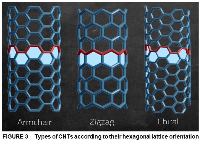 Carbon nanotubes are essentially molecular sheets of carbon atoms, also known as graphene, which are arranged in a hexagonal lattice or honeycomb arrangement – a bit like chicken wire. These sheets are organized in layers and manipulated into a cylindrical shape. So basically, graphene is the basis for Carbon Nanotubes. You can’t have Carbon Nanotubes without graphene. Now, these nanotubes can be designed and arranged in many ways, structurally they can be: